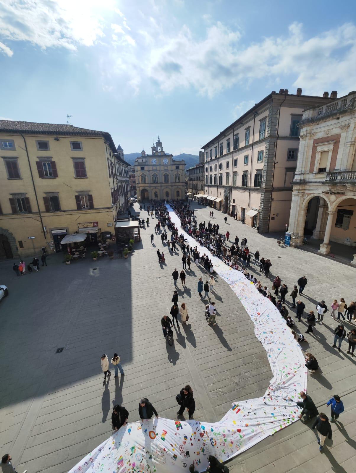 Un drappo lungo quasi cento metri ha trasformato il centro storico di Città di Castello in un palcoscenico di pace. La “eco-bandiera collettiva della pace più lunga del mondo” è stata srotolata tra due ali di folla commossa subito dopo le 16, portando con sé colori, messaggi e disegni realizzati da 800 bambini di scuole italiane e internazionali.