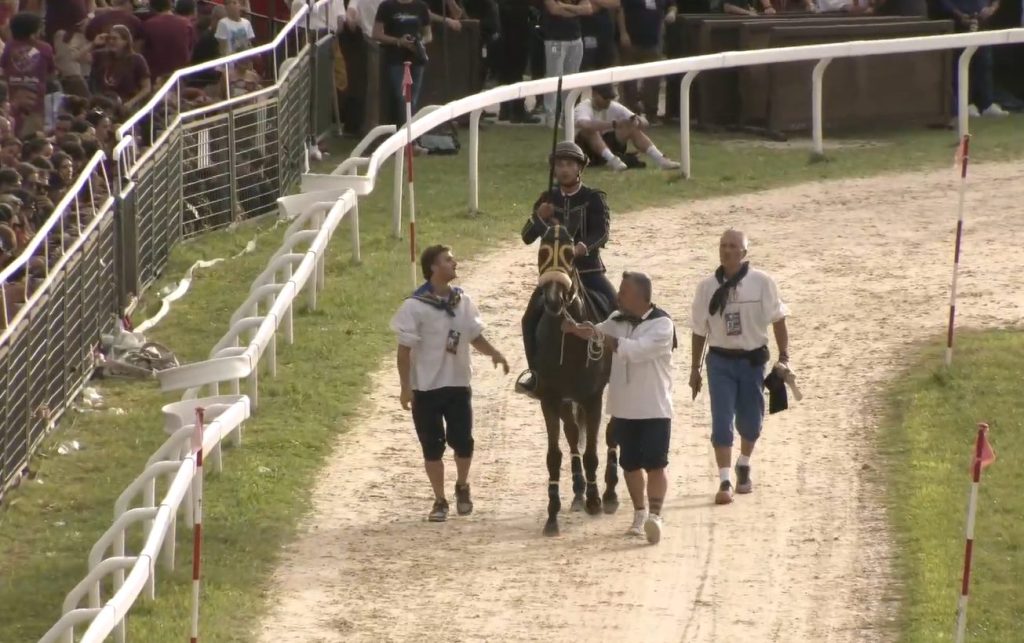 In sella a Altrimenti, Innocenzi ha firmato un tempo straordinario: 2 minuti, 40 secondi e 96 centesimi, regalando al Cassero il 18esimo Palio di Giostra. La corsa, praticamente senza errori, ha messo sin da subito in chiaro la superiorità del binomio, che non ha mai perso il controllo del campo. Una prestazione impeccabile, suggellata da un gesto che ha commosso i presenti: appena ricevuto il Palio dalle mani del priore Serafini, Innocenzi ha raggiunto la piccola Bianca, la figlia nata pochi giorni fa, dedicandole la storica vittoria.
