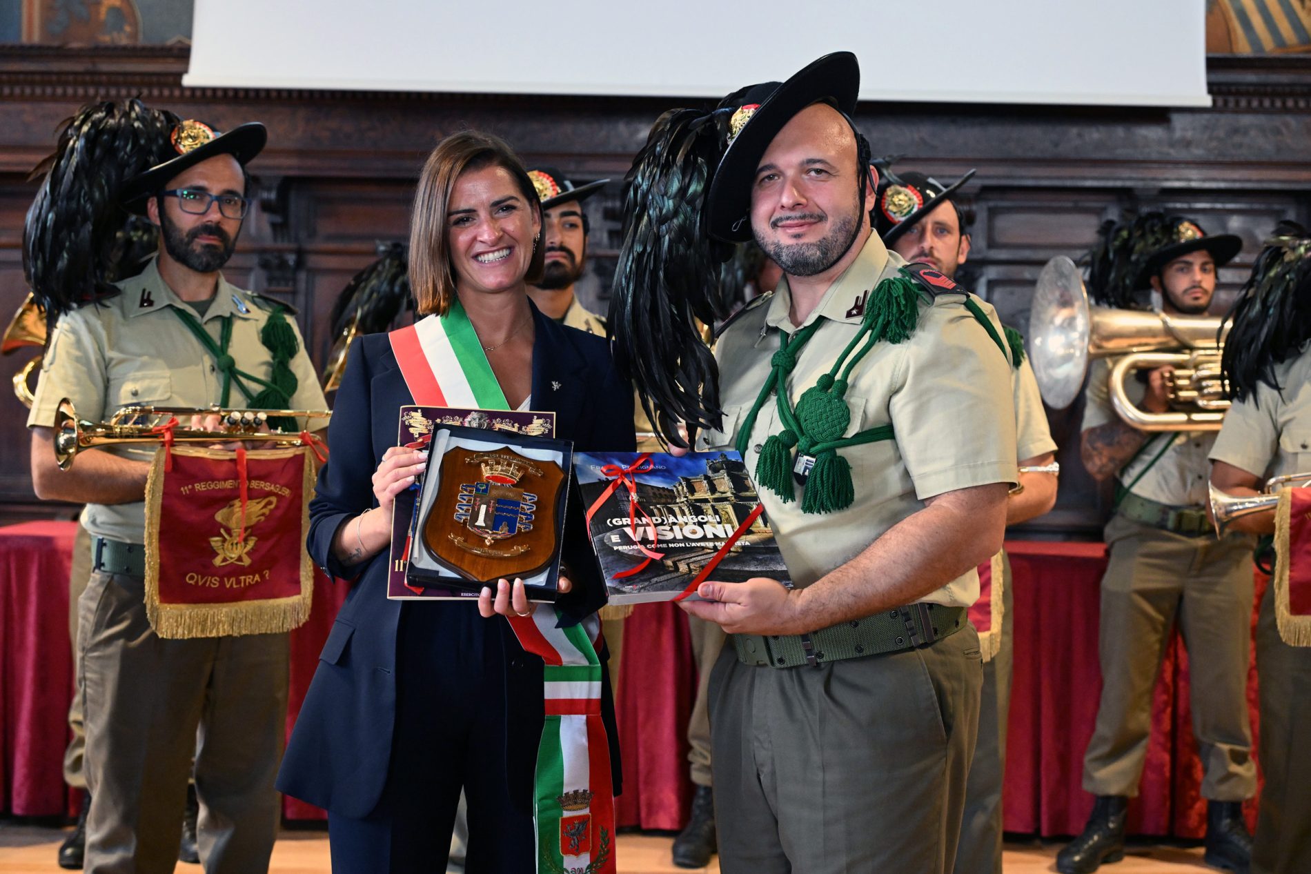 Uno dei momenti più istituzionali si è svolto all’interno della Sala dei Notari, dove è stata presentata ufficialmente la Fanfara dell’11° Reggimento Bersaglieri, formata da militari professionisti in servizio a Orcenico Superiore (PN). Il comandante Silvestrini ha illustrato la composizione e le attività della fanfara, attiva sia in Italia sia all’estero. Alla cerimonia è seguito lo scambio di doni ufficiali con la sindaca Ferdinandi.