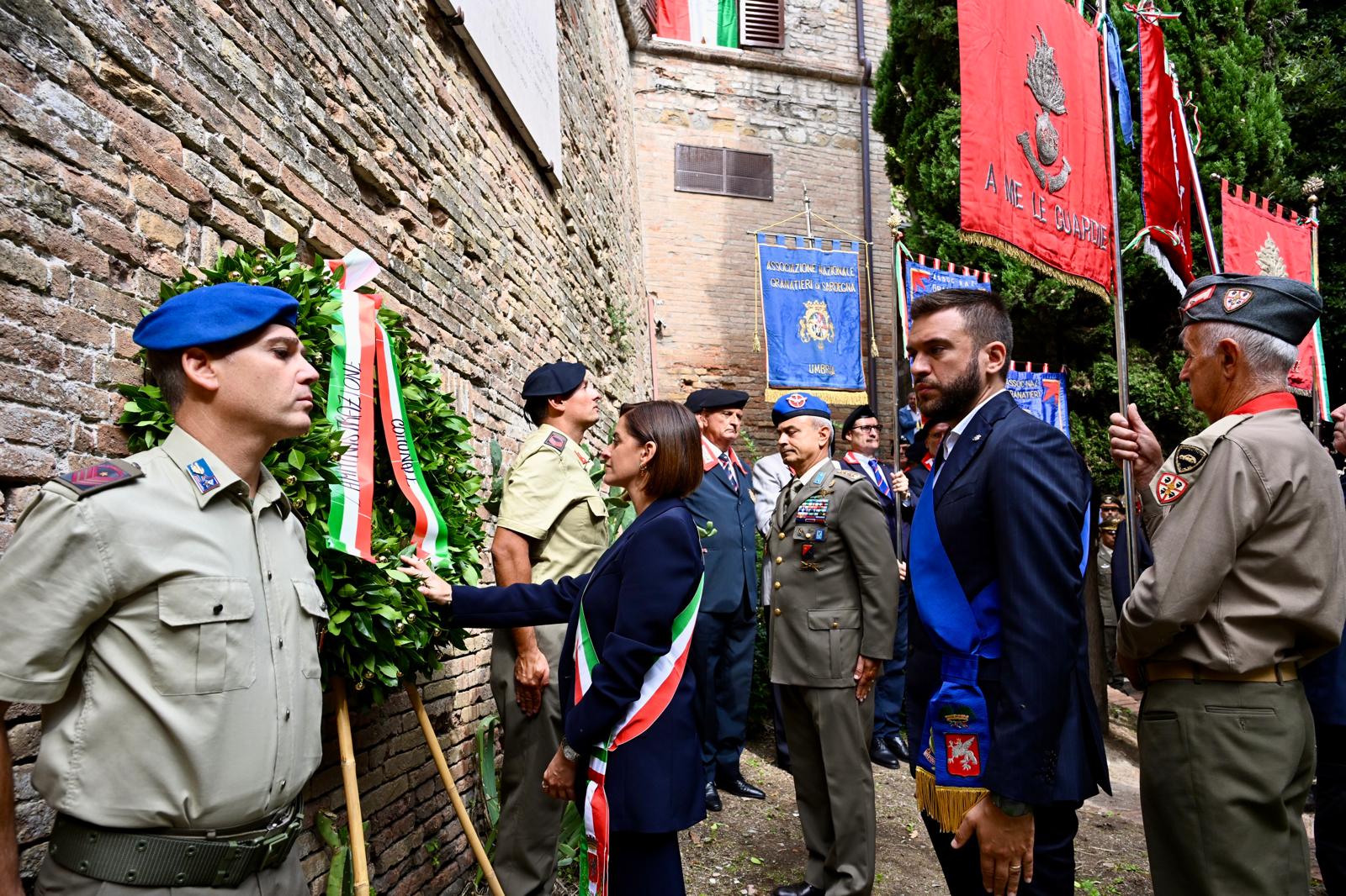 Il corteo delle autorità ha attraversato un borgo Sant’Antonio vestito a festa, fino a raggiungere porta Santa Margherita, luogo dove fecero ingresso i granatieri del 1° e 2° Reggimento. Qui, Maurizio Ceccotti, presidente dell’Associazione nazionale “Granatieri di Sardegna” dell’Umbria, ha ricordato il sacrificio degli uomini che, combattendo, permisero l’ingresso in città e l’innalzamento del tricolore.